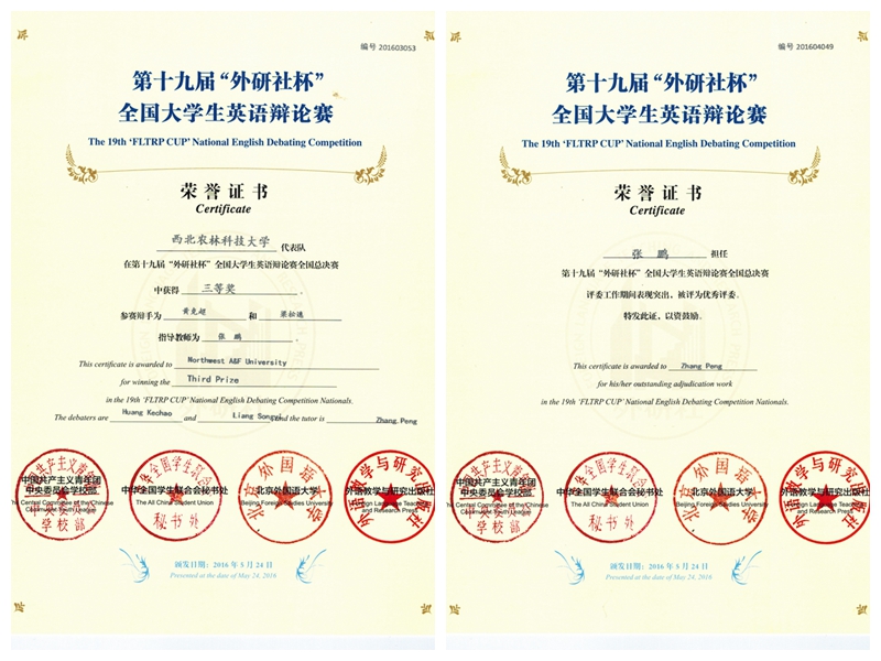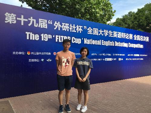 5月18-24日,第十九届“外研社杯”全国大学生英语辩论赛在北京外国语大学隆重举行。我系2014级学子黄克超和梁松逸稳扎稳打,充分发挥英语口语与思辨能力,获得全国总决赛三等奖。指导教师我系张鹏老师荣获 “优秀评委”称号。