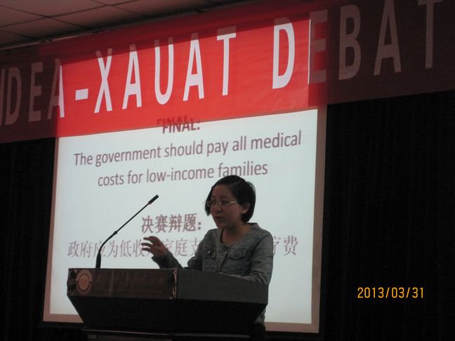 2013年3月29日,“IDEA—XAUAT”国际英文辩论赛于在西安建筑科技大学举行。由我系邓仁毅老师带领的来自的外语系、创新实验学院、食品学院、动物医学院、经管学院、机电学院、农学院等七个学院的八名同学代表我校参加了本次比赛。在与来自西安交通大学、西安外国语大学、西安电子科技大学和Linfield college等各大高校的60多支英文辩论队伍的循环赛中,我校食品学院张月,动物医学院袁春燕同学一组进入决赛,取得了一等奖的好成绩。
