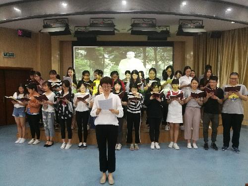 齐颂《麦神颂》,传承西农情。“……新麦兴国民感戴,劳模冠冕馈书生。饱食难忘饥肠苦,鼓腹常歌教授情……”《麦神颂》一文由张波教授作文、安宁教授作画,来纪念赵洪璋院士诞辰100周年。全文共五节,每节由八句组成,采用排律的形式,朗朗上口,内涵丰富,主要讲述了赵洪璋院士一生培育小麦品种,救了大半个中国的光辉事迹。外语系本科生党支部组织全体本科生党员齐颂这一诗文,由本科生第一党支部书记王丽萍领颂,学生党员跟颂。朗诵过程中,同学们意气风发,感情真挚,充分展现了对赵洪璋院士的敬畏和赞扬之情。