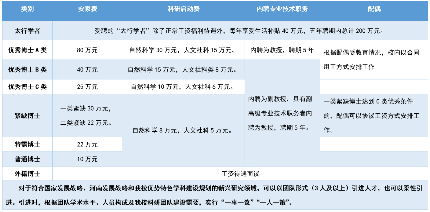 河南科技学院坐落于太行南麓、牧野大地的豫北明珠城市——新乡市。学校是一所以农科为主,理学、工学、教育学、管理学、文学、经济学、法学、艺术学等学科共同发展的综合性本科院校。学校始建于1939年,前身为中国共产党早期创建的延安自然科学院大学部生物系,历经北方大学农学院、华北大学农学院、华北大学农学院长治分院、北京农业大学长治分校、平原农学院、百泉农业专科学校、河南职业技术师范学院等时期。2004年5月,经教育部批准,更名为河南科技学院。 学校占地面积2478亩,有省部级重点学科开放实验室等32个,河南省科技创新团队等24个,有省博士后研发基地和院士工作站3个。学校设有64个本科专业,4个硕士学位授权一级学科、21个硕士学位授权二级学科,有农业、机械工程和教育硕士专业学位授权点,硕士专业学位研究生教育涵盖3个类别28个领域。现有全日制本科生及研究生34000余人,教职工1680余人,其中专任教师1358人,博士、硕士生导师380余人,“双聘院士”和中原学者7人,省、校级特聘教授24人,教授152人,副教授537人;博士、在读博士460余人,国家有突出贡献的中青年科技管理专家、国家有突出贡献专家、河南省优秀专家18人,全国模范教师、优秀教师12人,河南省教学名师、河南省学术技术带头人、河南省优秀教师、河南省优秀中青年骨干教师等164人,教育部新世纪优秀人才支持计划、河南省杰出人才创新基金、河南省杰出青年科学基金、河南省高校杰出科研人才创新工程、河南省高校科技创新人才支持计划等项目获得者53人。聘请中科院院士赵其国、盖钧镒、成卓敏,中国工程院院士张改平、陈焕春、喻树迅、陈宗懋、程顺和、张新友等70余名国内外知名专家、学者为兼职教授、客座教授。 学校大力实施“科技兴校”战略,科技创新能力显著提升。改革开放以来,完成国际合作项目,国家“863”“973”计划、自然科学基金、重大科技攻关、转基因生物重大科技专项支撑计划等科研课题3629项,获科技成果奖1546项,其中国家技术发明二等奖3项,国家科技进步奖7项。学校培育的小麦高产品种“百农3217”,获国家发明二等奖,创造社会经济效益50亿元;小麦新品种“百农矮抗58”“百农207”、抗虫棉花新品种“百棉1号”“百棉985”通过国家农作物新品种审定,在全国大面积种植并推广到吉尔吉斯斯坦等中亚国家,“百农矮抗58”连续6年成为河南及黄淮南部麦区推广面积最大的品种,累计种植面积超过3亿亩,增产效益达300余亿元,2013年荣获国家科技进步一等奖,为国家粮食核心区和中原经济区建设做出了重大贡献。 为推进人才强校战略,河南科技学院现面向海内外招聘英才,诚邀您加盟!这里有您成长的平台,这里是您展示才华的舞台! 一、招聘条件 1.太行学者。年龄不超过50周岁,并具备下列条件之一: (1)国家自然科学奖、国家技术发明奖、国家科技进步奖的主要完成人(一等奖前5名、二等奖前3名)或省部级科技成果一、二等奖的主持人; (2)主持国家自然科学基金重大或重点项目1项或主持国家自然科学基金面上项目2项; (3)在《Nature》《Science》《Cell》等国际顶尖期刊上发表学术论文1篇或近五年来在SCI一区发表论文至少5篇(限第一作者或通讯作者); (4)近五年来,纵向科研经费实际到账700万或横向科研经费实际到账1000万; (5)近五年来,主持国家自然科学基金面上项目1项并在SCI一区发表学术论文至少三篇(限第一作者或通讯作者)。 2.优秀博士A类。年龄一般不超过40周岁,具有学术带头人培养潜质,且符合下列条件之一: (1)全国优秀博士学位论文获得者(含提名论文); (2)主持国家级科研项目,且在SCI一区(中科院分区,下同)或本专业国际权威期刊发表学术论文1篇,论文经同行专家评议达到优秀博士A类水平; (3)自然科学类博士在SCI一区发表本专业高水平学术论文2篇,人文社科类博士在河南省教育厅认定的A类期刊发表学术论文2篇,论文经同行专家评议达到优秀博士A类水平; (4)以前三作者在《Nature》《Science》《Cell》等国际顶尖期刊发表学术论文1篇,且经同行专家评议达到优秀博士A类水平。 3.优秀博士B类。年龄一般不超过35周岁,原则上第一学历为全日制普通本科,且符合下列条件之一: (1)省优秀博士学位论文获得者或中科院百篇优秀博士论文获得者; (2)主持国家级科研项目,且在SCI期刊或本专业权威期刊发表学术论文1篇,论文经同行专家评议达到优秀博士B类水平; (3)自然科学类博士在SCI一区发表本专业学术论文1篇,或在SCI二区发表本专业学术论文2篇,论文经同行专家评议达到优秀博士B类水平; (4)人文社科类博士在河南省教育厅认定的A类期刊发表论文1篇;或在B类期刊发表论文2篇;或被人大复印资料全文转载2篇,论文经同行专家评议达到优秀博士B类水平。 4.优秀博士C类。年龄一般不超过35周岁,原则上第一学历为全日制普通本科,且符合下列条件之一: (1)自然科学类博士在SCI二区发表本专业学术论文1篇,或在SCI三区发表本专业学术论文2篇; (2)人文社科类博士在河南省教育厅认定的B类期刊发表论文1篇,或在CSSCI源期刊上发表论文3篇。 5.紧缺博士。年龄一般不超过35周岁,原则上第一学历为全日制普通本科,且符合下列条件: (1)所学专业方向符合我校2018年招聘紧缺博士的专业方向,详见附件一; (2)自然科学类博士在SCI或EI或本学科一级学报发
